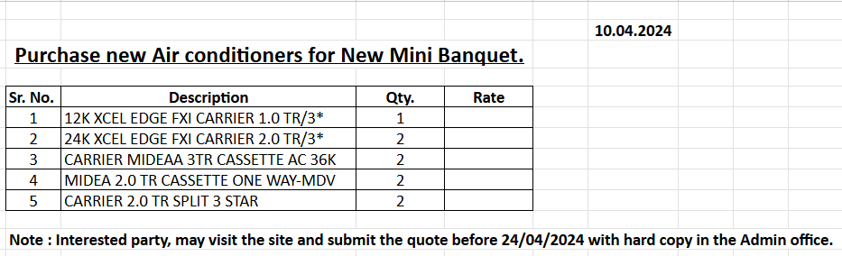 | 10th April 2024 | Purchase New Air Conditioners for New Mini Banquet. | Click Here |