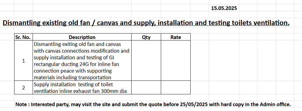 | 15th May 2025 | Dismantling existing old fan / canvas and supply, installation and testing toilets ventilation | Click Here |