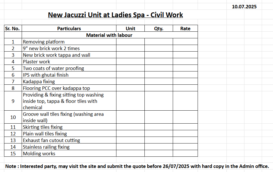 | 10th July 2025 | New Jacuzzi Unit at Ladies Spa - Civil Work | Click Here |