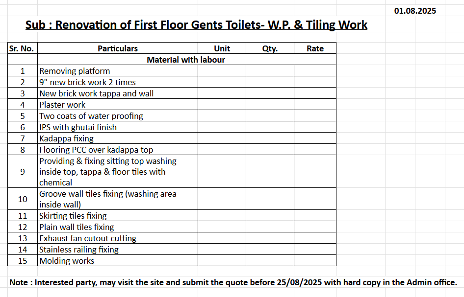 | 1st August 2025 | Renovation of First Floor Gents Toilets - W.P. & Tiling Work | Click Here |
